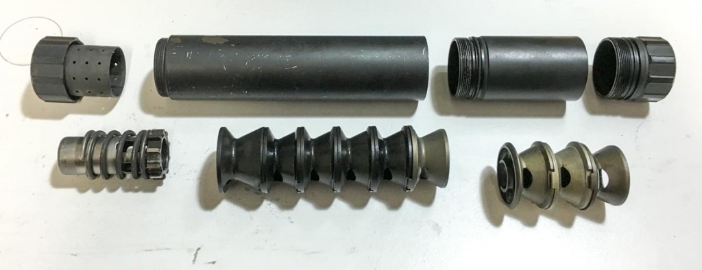 Inside the tube are a metric boat load of individual baffles. At a glance, they look similar, but on closer examination, you’ll see that they have slightly different shapes and functions. One, and only one, is shaped to be the first and it’s made from stainless steel to deal with the harshest portion of the muzzle blast. After that, a series of interlocking steel baffles build out the stack. At the end of the short tube, there is an end baffle that has a smooth ring to interface with either the end cap (short configuration) or the base of the first baffle in the extension tube. As you might guess, and can see in the pictures here, three additional baffles are made to fit into the extension tube.