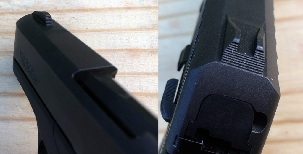 The sights are a simple black and almost impossible to pick up against a dark background. But they are serrated to help reduce glare.