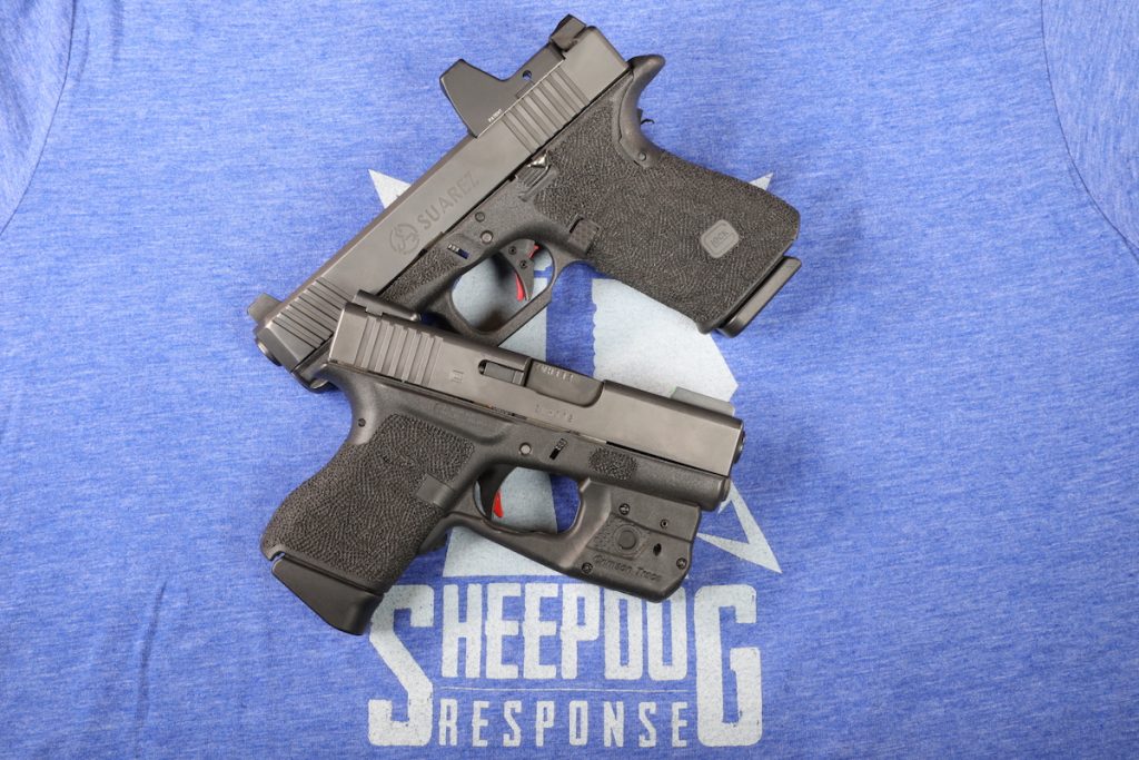 Author’s guns used in the course. Glock 19 (top) includes a Suarez International slide and barrel, Trijicon RMR optic, and Trijicon night sights. Glock 43 (bottom) features a Crimson Trace Laserguard Pro light/laser and Truglo night sights. Both pistols have Zev Technologies triggers and and custom stippling from Brimstone Gunsmithing.
