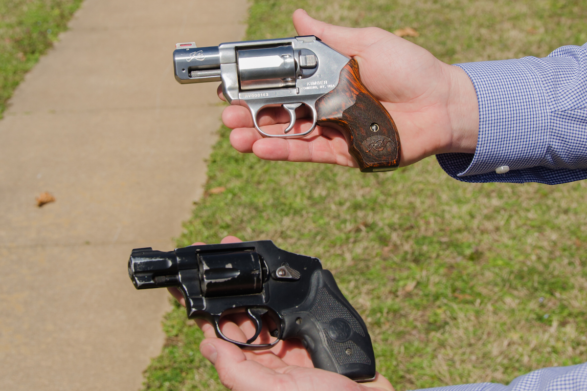 The stainless Kimber (top) is not appreciably larger than a Smith & Wesson J-frame snubbie (below), buts packs in one more round.