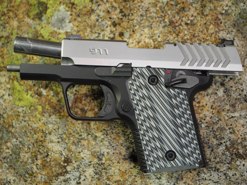 The 911 — “nine-one-one” — is a sub-compact single-action semi-automatic pistol. It’s just 5.9″ long and 3.9″ tall and weighs less than a pound at 15.3 ounces, about a third the weight of a full-size 1911. The barrel is just 3″ long.