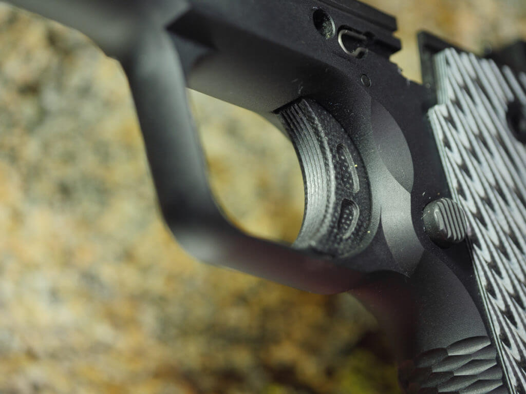 The trigger pivots, unlike the 1911’s sliding trigger. On average, my unit consistently breaks at 7 pounds. It’s got a short takeup and a very short and crisp reset. There is extremely little play side to side.