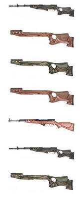The SKS stock is a Monte Carlo variety, and I have to say really elegant. I am someone who would never even think to upgrade an SKS to a nice deer rifle, but if you are, this stock is really something else. It comes in all but the red color, and also has a laminate they call camo, because it is greenish. They make a right and left handed as well. And there is a standard SKS style stock with a cheek piece if you just want to get that cosmoline sponge off of your otherwise nice and usable SKS rifle.