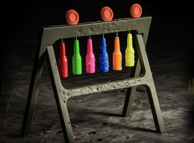 The Complete Target Frame includes a stand, 6 bottle shaped targets, and hangers. The product is UV resistant, and you can pick it up with one hand. Added bonus, should you succeed many thousands of rounds from now in using it up, the whole rig is recyclable.
