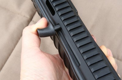The upper receiver on the gun is aluminum and the lower is polymer. This means that the top Picatinny rail is metal, and the one you see on the bottom of the forend is plastic. If you look at the pictures, you will see that the magazine well is shaped into a front grip, similar to the profile that you see on some aftermarket Magpul front grips. The balance point of the gun is on the magazine well, which ergonomically gives you a tight and comfortable shooting profile without the need for an attached front grip. This leaves the forend rail free for a light and/or laser combo. And if you want something else on the front of the gun, like a camera or something, there are two metal screw sleeves molded into the grip at the 3 o’clock and 9 o’clock positions meant for attaching standard rail sections.