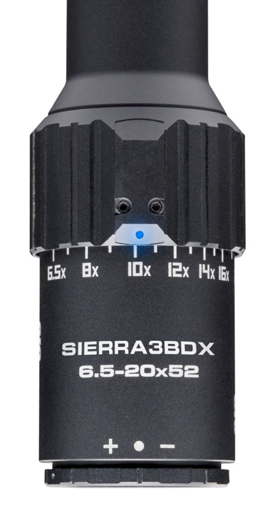 Sig Sierra3 BDX riflescopes look and feel the same as standard scopes. Only the blue LED on the power ring gives away the scope’s additional utility [Sig photo].